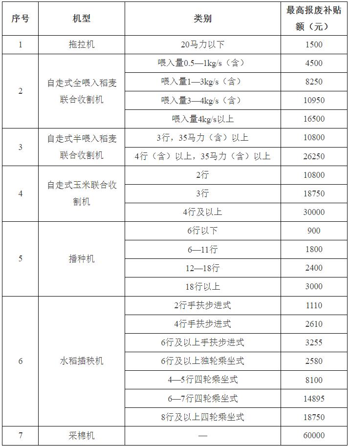 報(bào)廢20馬力以下拖拉機(jī),單臺(tái)最高報(bào)廢補(bǔ)貼額由1000元提高到1500元;報(bào)廢聯(lián)合收割機(jī)、水稻插秧機(jī)、播種機(jī)并新購(gòu)置同種類(lèi)機(jī)具,按不超過(guò)50%提高報(bào)廢補(bǔ)貼標(biāo)準(zhǔn),單臺(tái)最高報(bào)廢補(bǔ)貼額不超過(guò)3萬(wàn)元;報(bào)廢并更新購(gòu)置采棉機(jī),單臺(tái)最高報(bào)廢補(bǔ)貼額由3萬(wàn)元提高到6萬(wàn)元(詳見(jiàn)附件)。除20馬力以下拖拉機(jī)外,對(duì)只申請(qǐng)報(bào)廢不新購(gòu)置的,繼續(xù)執(zhí)行《通知》規(guī)定的報(bào)廢補(bǔ)貼標(biāo)準(zhǔn)。對(duì)自《通知》印發(fā)之日起提交報(bào)廢補(bǔ)貼申請(qǐng)的,按調(diào)整后的報(bào)廢補(bǔ)貼標(biāo)準(zhǔn)執(zhí)行,對(duì)已領(lǐng)取報(bào)廢補(bǔ)貼的,補(bǔ)齊差額部分補(bǔ)貼。