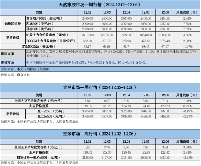 天然橡膠、大豆、玉米市場(chǎng)一周行情(2024.12.02-12.06)