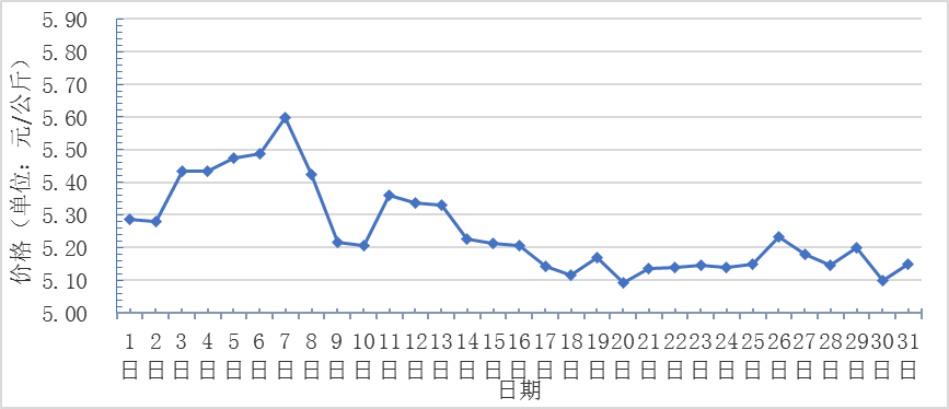 1月,全國重點監(jiān)測農(nóng)產(chǎn)品批發(fā)市場香蕉總交易量達2.4萬噸,同比增長26.3%,環(huán)比下降14.3%;總交易價值20640.1萬元,同比增長66.6%,環(huán)比增長22.4%。日平均價格最高為5.6元/千克,最低為5.1元/千克,全月平均價格為5.3元/千克,同比下降14.5%,環(huán)比下降8.6%(每日價格變化如圖)。