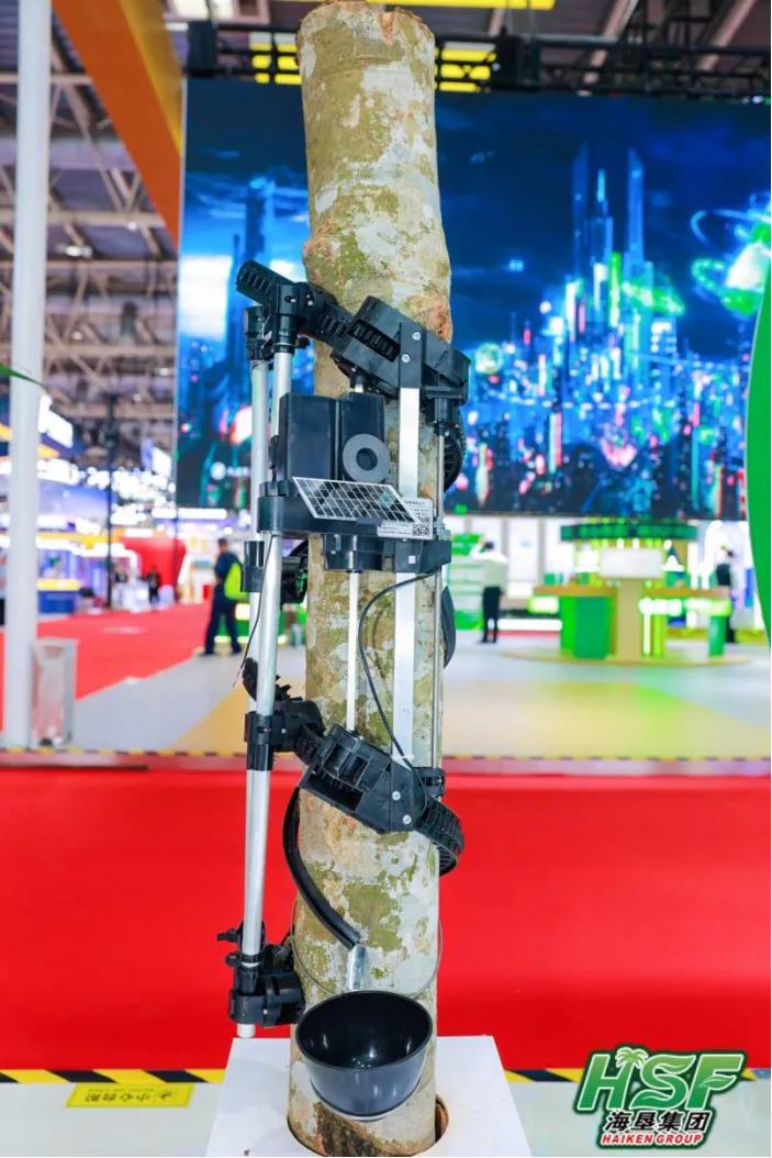 “和傳統(tǒng)人工割膠相比,這臺智能割膠機有什么優(yōu)勢?”在海墾集團展館天然橡膠展區(qū)前,一臺固定在橡膠樹干上的智能割膠機,吸引了不少參展嘉賓的目光。