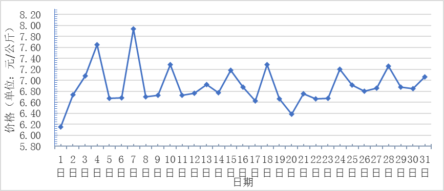 10月,全國重點(diǎn)監(jiān)測農(nóng)產(chǎn)品批發(fā)市場香蕉總交易量達(dá)2.3萬噸,同比上漲9.5%,環(huán)比下降11.5%;總交易價(jià)值15349.4萬元,同比上漲11.9%,環(huán)比下降4.9%。日平均價(jià)格最高為8.0元/千克,最低為6.2元/千克,全月平均價(jià)格為 6.9元/千克,同比上漲3.0%,環(huán)比上漲13.1%(每日價(jià)格變化如圖)。