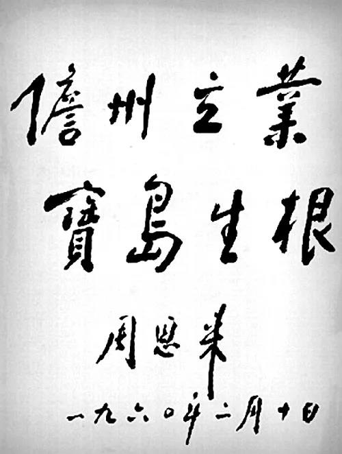 因?yàn)閮稍菏菑膹V州搬下來的,儋縣是個(gè)小縣城,因此兩院的領(lǐng)導(dǎo)班子提出要在寶島安家生根的口號(hào)。隨后我請(qǐng)總理題詞??偫砭透牧宋业膶?duì)聯(lián)兩個(gè)字,寫下了“儋州立業(yè),寶島生根”。總理的立業(yè)生根親筆題詞,對(duì)從廣州來的專家、教授、學(xué)生鼓勵(lì)很大。當(dāng)時(shí)我們把總理的題詞寫成大標(biāo)語掛在研究大樓上,在兩院進(jìn)行生根立業(yè)教育,使兩院的廣大師生深受鼓舞。