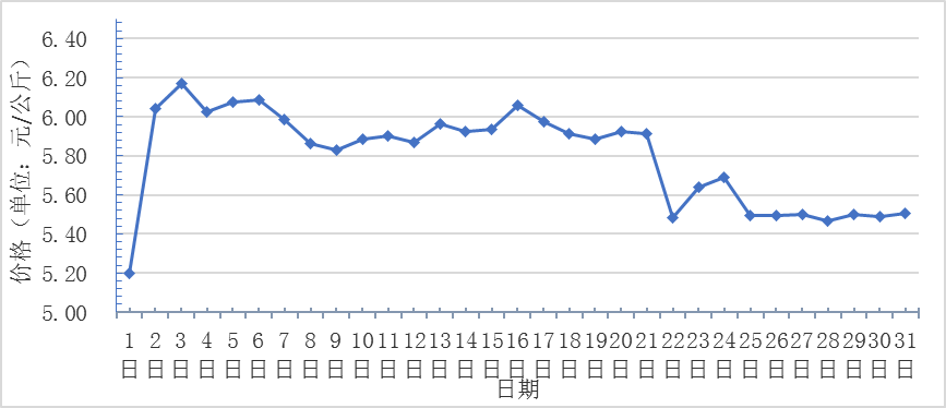 12月,全國重點監(jiān)測農(nóng)產(chǎn)品批發(fā)市場香蕉總交易量達2.8萬噸,同比上漲12%,環(huán)比上漲7.7%;總交易價值16863.2萬元,同比上漲1.1%,環(huán)比上漲2.9%。日平均價格最高為6.2元/千克,最低為5.2元/千克,全月平均價格為5.8元/千克,同比下降6.5%,環(huán)比下降3.3%(每日價格變化如圖)。