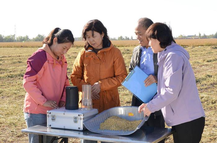 關(guān)二騰的大豆田位于新疆農(nóng)墾科學(xué)院與一四七團(tuán)共同打造的“新大豆 23 號(hào)”千畝高產(chǎn)創(chuàng)建示范田內(nèi)。9 月 19 日,來(lái)自中國(guó)農(nóng)業(yè)科學(xué)院、河北省農(nóng)林科學(xué)院、新疆農(nóng)業(yè)科學(xué)院、新疆農(nóng)業(yè)大學(xué)、兵團(tuán)農(nóng)業(yè)技術(shù)推廣總站的專(zhuān)家們組成專(zhuān)家組,進(jìn)行實(shí)收產(chǎn)量鑒定。在百畝方實(shí)打?qū)嵤?22.55 畝,平均畝產(chǎn) 439.17 公斤;千畝方實(shí)打?qū)嵤?163.98 畝,平均畝產(chǎn) 400.05 公斤。反復(fù)測(cè)算核對(duì)后,中國(guó)農(nóng)業(yè)科學(xué)院油料作物研究所研究員周新安宣布:“兵團(tuán)春大豆百畝方和千畝方單產(chǎn)雙雙創(chuàng)下全國(guó)紀(jì)錄,全國(guó)大豆大面積單產(chǎn)新紀(jì)錄誕生?!?