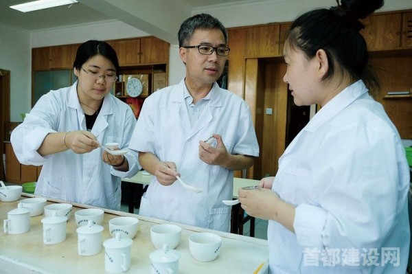 京華茶業(yè)公司總經(jīng)理助理、“北京茉莉花茶拼配工藝”非物質(zhì)文化遺產(chǎn)項(xiàng)目第七代傳承人樓國(guó)柱(中)進(jìn)行茶葉審評(píng)。