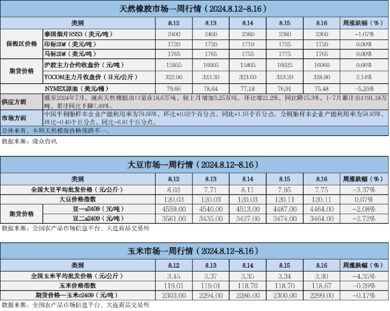 天然橡膠、大豆、玉米市場(chǎng)一周行情(2024.08.12-08.16)