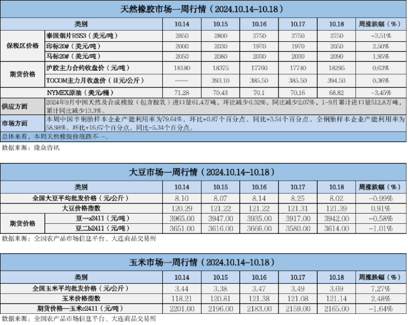 天然橡膠、大豆、玉米市場一周行情(2024.10.14-10.18)