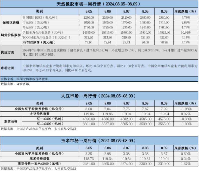 天然橡膠、大豆、玉米市場(chǎng)一周行情(2024.08.05-08.09)