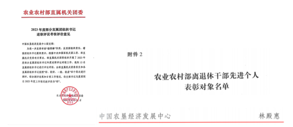 12.中心干部職工積極創(chuàng)優(yōu)爭(zhēng)先,獲得榮譽(yù)表彰8項(xiàng)。葉瑞云同志在農(nóng)業(yè)農(nóng)村部“以秋補(bǔ)夏、抗災(zāi)奪豐收”專項(xiàng)任務(wù)中獲個(gè)人記功,劉芳、樊思雨同志獲個(gè)人嘉獎(jiǎng)。李泓同志獲得2023年度農(nóng)業(yè)農(nóng)村部平安建設(shè)先進(jìn)個(gè)人稱號(hào)。劉陽(yáng)同志獲得2022—2023年度部直屬機(jī)關(guān)優(yōu)秀工會(huì)干部榮譽(yù)稱號(hào)。馬晨雨同志在2023年度部分直屬團(tuán)組織書記述職評(píng)議考核被評(píng)價(jià)為“好”。季剛同志獲得2021—2023年度農(nóng)業(yè)農(nóng)村部直屬機(jī)關(guān)青年理論學(xué)習(xí)標(biāo)兵榮譽(yù)稱號(hào)。林殿惠獲得農(nóng)業(yè)農(nóng)村部系統(tǒng)離退休干部先進(jìn)個(gè)人榮譽(yù)稱號(hào)。