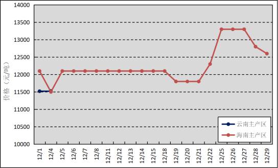 國內(nèi)主產(chǎn)區(qū):12月,云南產(chǎn)區(qū)全面停割,海南產(chǎn)區(qū)割膠工作進(jìn)入尾聲,原料供應(yīng)減少。海南原料膠(折干膠)月均價格為12267元/噸,環(huán)比下跌51元/噸。