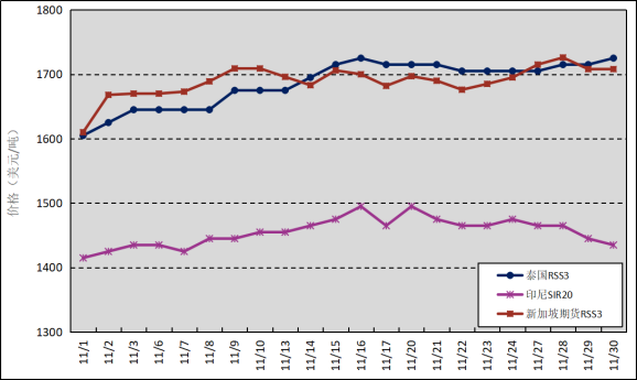 國(guó)外主產(chǎn)區(qū):11月,泰國(guó)RSS3平均價(jià)格為1686美元/噸,環(huán)比上漲20美元/噸,最高價(jià)為1725美元/噸,最低價(jià)為1605美元/噸;印尼SIR20平均價(jià)格為1455美元/噸,環(huán)比上漲21美元/噸,最高價(jià)為1495美元/噸,最低價(jià)為1415美元/噸;新加坡RSS3期貨主力合約月均結(jié)算價(jià)格為1689美元/噸,環(huán)比上漲52美元/噸,最高價(jià)為1726美元/噸,最低價(jià)為1610美元/噸。