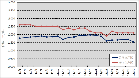 國(guó)內(nèi)主產(chǎn)區(qū):11月,云南產(chǎn)區(qū)逐步進(jìn)入停割期,產(chǎn)量減少;海南產(chǎn)區(qū)正常割膠。云南原料膠(折干膠)月均價(jià)格為11807元/噸,環(huán)比上漲140元/噸;海南原料膠(折干膠)月均價(jià)格為12318元/噸,環(huán)比下降811元/噸。