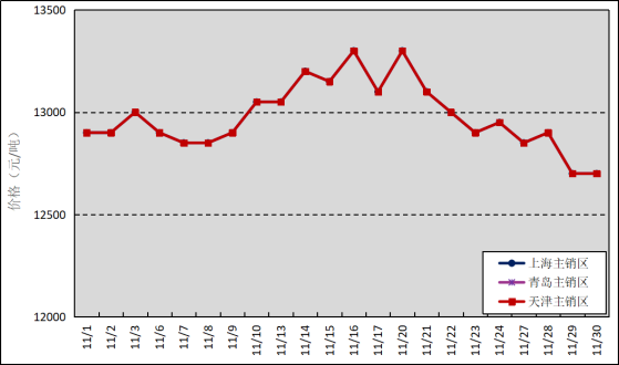國(guó)內(nèi)主銷區(qū):11月,國(guó)產(chǎn)全乳標(biāo)準(zhǔn)膠上海市場(chǎng)平均價(jià)格12980元/噸,環(huán)比下跌214元/噸,最高價(jià)為13300元/噸,最低價(jià)為12700元/噸;青島市場(chǎng)平均價(jià)格12980元/噸,環(huán)比下跌214元/噸,最高價(jià)為13300元/噸,最低價(jià)為12700元/噸;天津市場(chǎng)平均價(jià)格12980元/噸,環(huán)比下跌214元/噸,最高價(jià)為13300元/噸,最低價(jià)為12700元/噸。