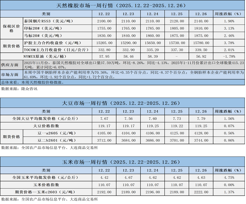天然橡膠、大豆、玉米市場一周行情(2025.12.22-12.26)