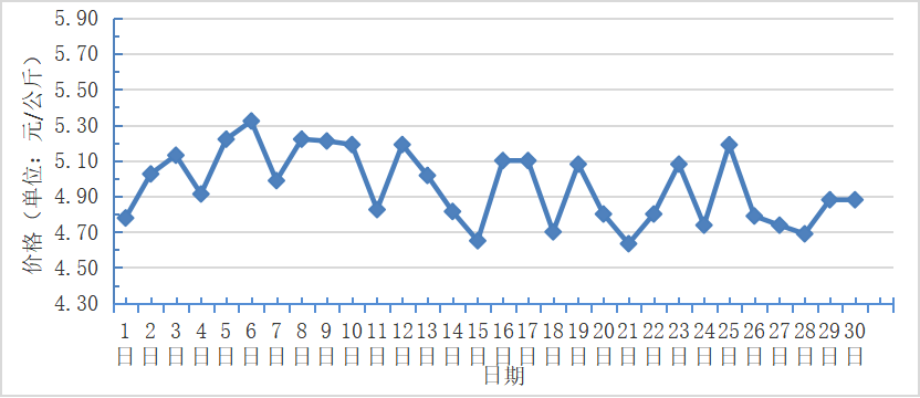 9月,全國重點監(jiān)測農產品批發(fā)市場香蕉總交易量達2.2萬噸,同比上漲4.80%,環(huán)比下降4.3%;總交易價值12518.2萬元,同比下降9.1%,環(huán)比上漲6.1%。日平均價格最高為5.3元/千克,最低為4.7元/千克,全月平均價格為 5.0元/千克,同比下降25.4%,環(huán)比基本持平(每日價格變化如圖)。