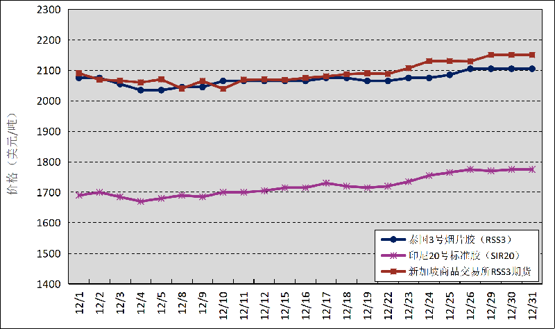 國外主產(chǎn)區(qū):12月,泰國3號(hào)煙片膠(RSS3)平均價(jià)格2071美元/噸,環(huán)比上漲23美元/噸,最高價(jià)2105美元/噸,最低價(jià)2035美元/噸;印尼20號(hào)標(biāo)準(zhǔn)膠(SIR20)平均價(jià)格1720美元/噸,環(huán)比上漲38美元/噸,最高價(jià)1775美元/噸,最低價(jià)1670美元/噸;新加坡商品交易所RSS3期貨主力合約月均結(jié)算價(jià)格2090美元/噸,環(huán)比上漲43美元/噸,最高價(jià)2150美元/噸,最低價(jià)2039美元/噸。