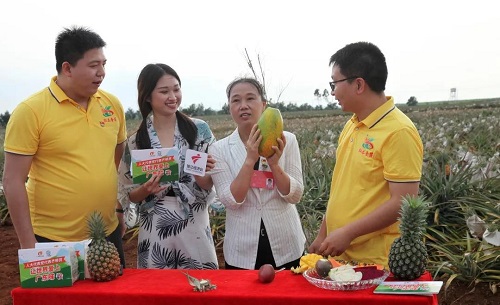直播間搭建在一望無(wú)垠的菠蘿地里,菠蘿、芒果、火龍果、百香果、木瓜、稻米、雜糧、山茶油、花生油……各種優(yōu)質(zhì)特色農(nóng)產(chǎn)品通過(guò)鏡頭,近距離地呈現(xiàn)在廣大網(wǎng)友面前。