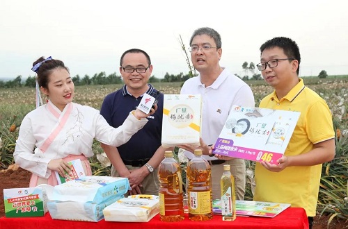 在廣東省紅星農(nóng)場(chǎng)直播分會(huì)場(chǎng),黨的十九大代表、廣東廣墾華豐糖業(yè)有限公司黨群工作部副部長(zhǎng)陳燕華,廣東省人大代表、湛江市飲食服務(wù)業(yè)商會(huì)、湛江市烹飪行業(yè)協(xié)會(huì)常務(wù)副會(huì)長(zhǎng)梁思橋走進(jìn)“菠蘿的?!?,為菠蘿、火龍果、山茶油等廣墾良品直播帶貨。