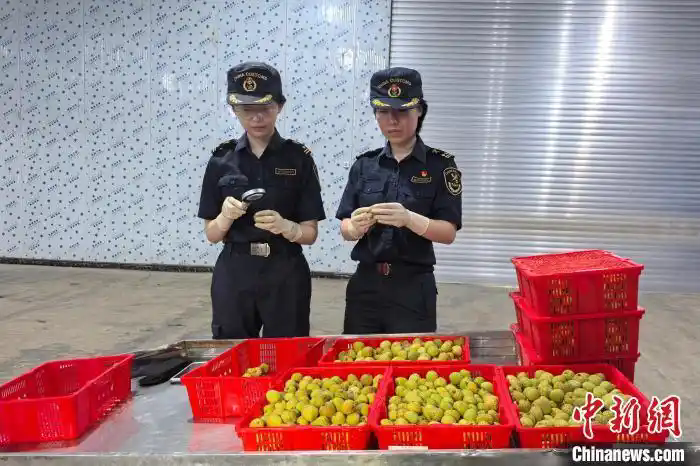 海關(guān)工作人員對今年茂名首批出口荔枝進(jìn)行查驗(yàn)。湯柏生 攝