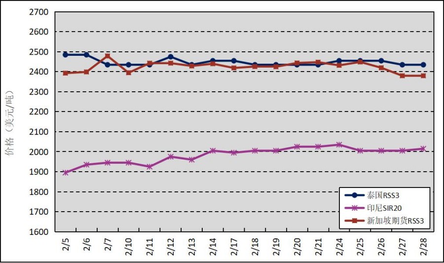 國(guó)外主產(chǎn)區(qū):2月,泰國(guó)RSS3平均價(jià)格為2448美元/噸,環(huán)比上漲21美元/噸,最高價(jià)為2485美元/噸,最低價(jià)為2435美元/噸;印尼SIR20平均價(jià)格為1984美元/噸,環(huán)比上漲81美元/噸,最高價(jià)為2035美元/噸,最低價(jià)為1895美元/噸;新加坡RSS3期貨主力合約月均結(jié)算價(jià)格為2425美元/噸,環(huán)比上漲35美元/噸,最高價(jià)為2479美元/噸,最低價(jià)為2380美元/噸。