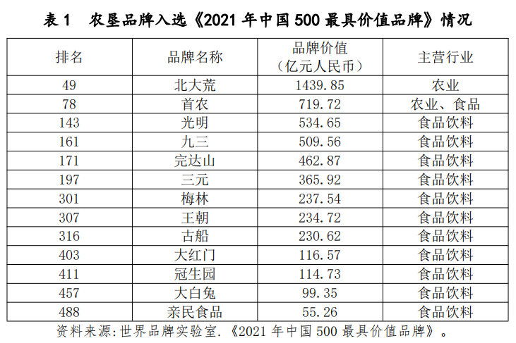 通過(guò)近幾年農(nóng)墾系統(tǒng)各單位的合力打造和培育,社會(huì)對(duì)農(nóng)墾的整體認(rèn)知不斷提升,一批有實(shí)力的墾區(qū)集團(tuán)品牌、企業(yè)品牌在農(nóng)業(yè)品牌發(fā)展中的地位不斷提升,農(nóng)墾系統(tǒng)形成了以中國(guó)農(nóng)墾公共品牌為核心、墾區(qū)(集團(tuán))公共品牌、企業(yè)品牌、產(chǎn)品品牌共同構(gòu)成的品牌矩陣。世界實(shí)驗(yàn)室公布的《2021年中國(guó)500最具價(jià)值品牌》中(表1),農(nóng)墾品牌有13個(gè),約占農(nóng)業(yè)、食品飲料類別的14%。