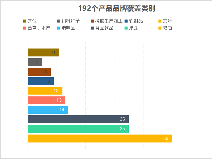 《中國(guó)農(nóng)墾品牌目錄》中,僅192個(gè)產(chǎn)品品牌其涵蓋范圍就包括糧油、果蔬、食品飲料、茶葉、乳業(yè)等多個(gè)領(lǐng)域,其中糧油類50個(gè)、果蔬類35個(gè)、食品飲料35個(gè),占所有收錄類別63%。與《中國(guó)農(nóng)業(yè)品牌目錄2019農(nóng)產(chǎn)品區(qū)域公用品牌》300個(gè)、11個(gè)門類相比,農(nóng)墾品牌全品類特征明顯。