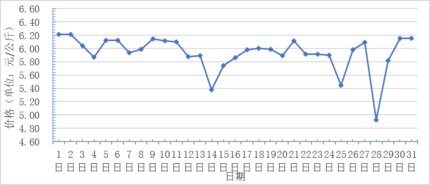 3月,全國(guó)重點(diǎn)監(jiān)測(cè)農(nóng)產(chǎn)品批發(fā)市場(chǎng)香蕉總交易量達(dá)2.2萬(wàn)噸,同比下降18.5%,環(huán)比增長(zhǎng)29.4%;總交易價(jià)值12278.1萬(wàn)元,同比下降14.2%,環(huán)比增長(zhǎng)24.8%。日平均價(jià)格最高為6.2元/千克,最低為4.9元/千克,全月平均價(jià)格為5.9元/千克,同比增長(zhǎng)11.5%,環(huán)比下降0.5%(注:按環(huán)比平均價(jià)格按兩位小數(shù)計(jì)算)(每日價(jià)格變化如圖)。