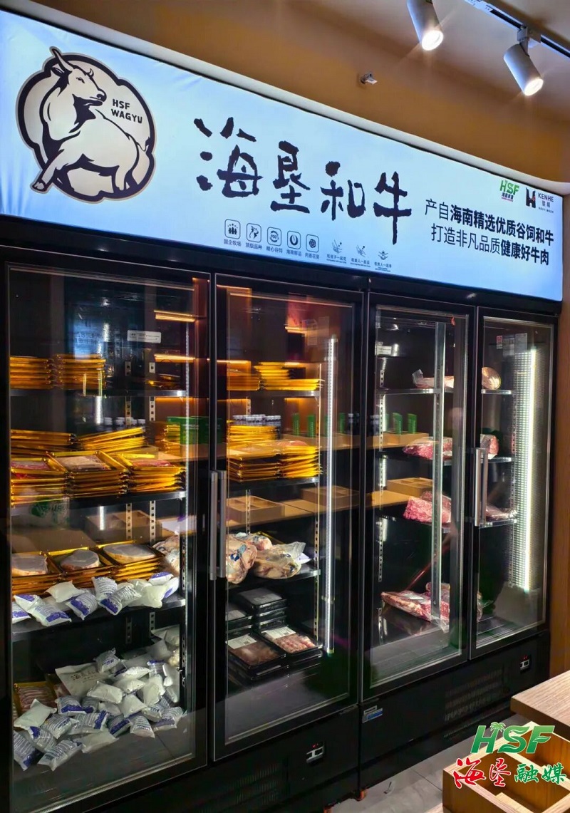 “和牛薈”選址于??趪Q(mào)核心商圈,輻射萬象城與周邊優(yōu)質(zhì)社區(qū)的高端消費群體,精準匹配其對品質(zhì)保障與體驗式消費的雙重需求。門店創(chuàng)新采用“一樓肉鋪+二樓餐飲”復合業(yè)態(tài),在一樓設置專業(yè)冰柜陳列區(qū)與透明分裝車間,消費者可直觀選購海墾和牛冰鮮、冷凍原條肉、定制禮盒,以及海墾集團旗下“海島福蛋”、胡椒等特色農(nóng)產(chǎn)品;二樓打造火鍋與鐵板燒融合的餐飲空間,實現(xiàn)“現(xiàn)選、現(xiàn)切、現(xiàn)烹”全鏈條消費閉環(huán),讓高端和牛產(chǎn)品融入日常飲食場景。