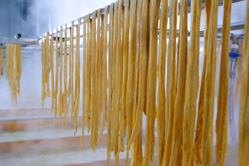 “大燉豆腐上桌嘍”。看著冒著熱氣的鮮嫩白軟的燉豆腐和金黃色的涼拌腐竹、炒豆皮,垂涎欲滴,食欲大增。眼前的一切,怎么也不能和幾十年前那個(gè)設(shè)施簡(jiǎn)陋的豆腐作坊聯(lián)系到一起。索倫牧場(chǎng)依托萬(wàn)畝大豆原糧基地,引進(jìn)現(xiàn)代化生產(chǎn)線,硬是把東北人的家常豆腐做出了包括豆腐、腐竹、豆皮、豆干等在內(nèi)的“豆尚索倫”系列大品牌!