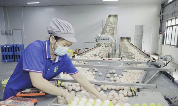 在雞蛋分揀車間,每一枚雞蛋都要經過由丹麥進口的賽諾沃生產線共12道工序才能達到出產的標準。次蛋光學篩選、食品級清洗、紫外線殺菌、裂紋聲波檢測、可食用白油覆膜、激光噴碼、全自裝箱……雞蛋自動化生產流程一氣呵成。“去年‘廣墾鳳鮮’雞蛋通過NSF無抗生素認證時,審核員都不敢相信中國農場能達到歐盟標準?!绷何暮曜院赖卣故局u蛋溯源系統,掃碼可見每枚蛋產自哪棟雞舍、哪批飼料?!?