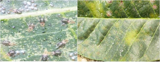 不同種類害螨危害癥狀有差別。六點始葉螨多在葉背危害,初期在葉脈基部呈現(xiàn)灰白色斑點,繼而沿葉脈擴展,同時顏色變深為黃色及黃褐色。六點始葉螨在嫩梢嫩葉的危害,呈現(xiàn)出受害部位顏色變深,扭曲畸形。東方真葉螨多在葉面危害,少見于葉背,受害部位出現(xiàn)白色小斑點,繼而小斑點匯結(jié)成灰綠色斑塊,嚴重者全葉枯黃。比哈小爪螨多發(fā)生在葉背危害,偶見葉面。葉片受害部位呈均勻的灰白色小斑點,發(fā)生嚴重時,整個葉片呈灰白色斑點,繼而整個葉片變黃,最后導致葉片枯黃。