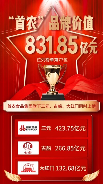 同時,首農(nóng)食品集團(tuán)旗下三元、古船、大紅門分別以423.75億元、266.85億元、132.68億元位列500強(qiáng)品牌第187、313、400位。首農(nóng)食品集團(tuán)及子品牌累計品牌價值超1600億元。