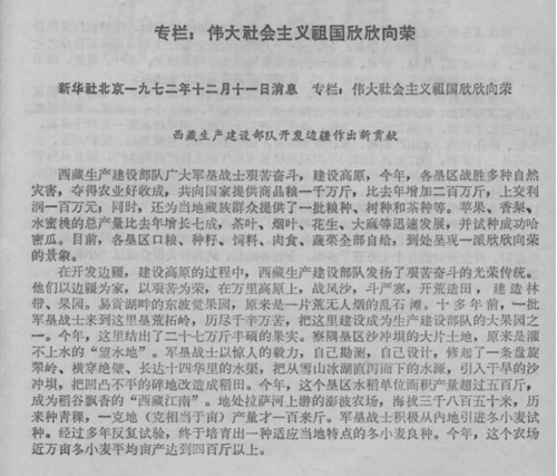 1972年,新華社《偉大社會(huì)主義祖國(guó)欣欣向榮》專欄,對(duì)西藏生產(chǎn)建設(shè)開發(fā)部隊(duì)的成就做了專題報(bào)道。他們以邊疆為家,以艱苦為榮,在萬(wàn)里高原上,戰(zhàn)風(fēng)沙,斗嚴(yán)寒,開荒造田,建造林帶、果園。