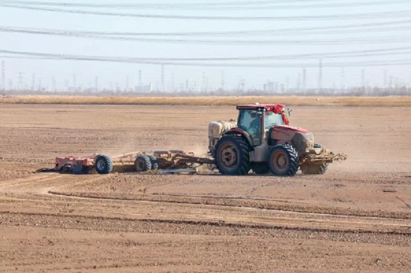 圖為寧夏農(nóng)墾前進(jìn)農(nóng)場正在開展聯(lián)合整地作業(yè)。 陳晨 攝