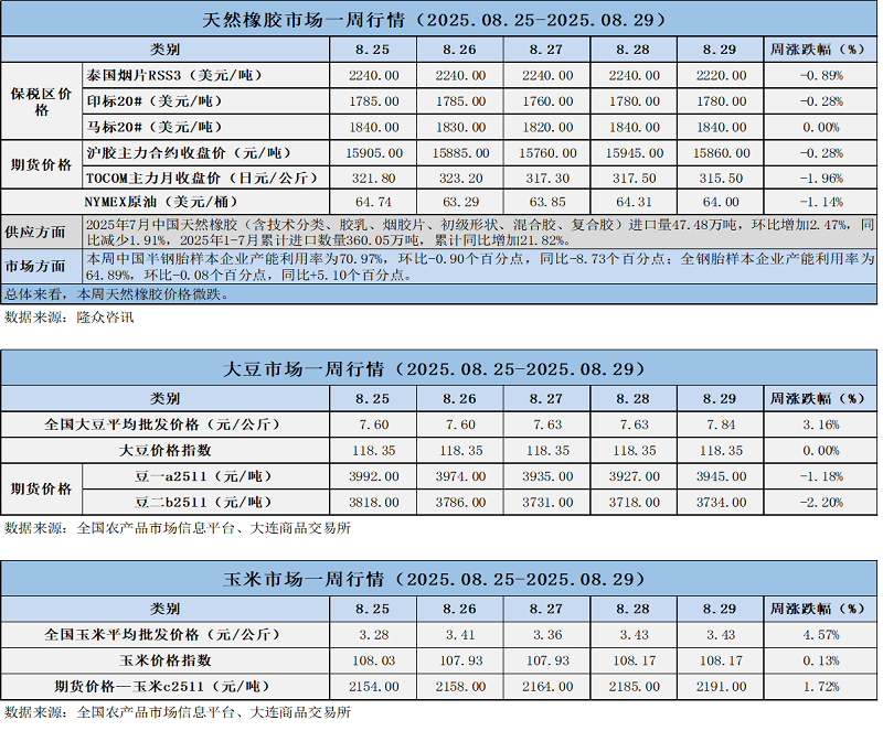 天然橡膠、大豆、玉米市場一周行情(2025.08.25-08.29)