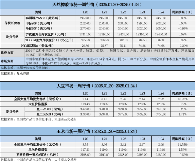 天然橡膠、大豆、玉米市場(chǎng)一周行情(2025.01.20-01.24)