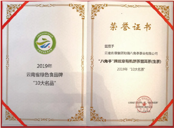 2019年,云南農(nóng)墾集團(tuán)勐海八角亭茶業(yè)有限公司“八角亭”牌“班章有機(jī)餅茶”榮獲云南省“10大名茶”稱號(hào);公司被評(píng)為云南省農(nóng)業(yè)產(chǎn)業(yè)化經(jīng)營(yíng)省級(jí)重點(diǎn)龍頭企業(yè);榮獲云南省“五一勞動(dòng)獎(jiǎng)狀”。