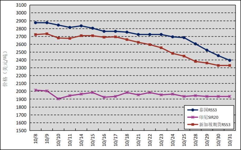 國外主產(chǎn)區(qū):10月,泰國RSS3平均價(jià)格為2715美元/噸,環(huán)比下跌68美元/噸,最高價(jià)為2875美元/噸,最低價(jià)為2395美元/噸;印尼SIR20平均價(jià)格為1956美元/噸,環(huán)比上漲77美元/噸,最高價(jià)為2015美元/噸,最低價(jià)為1905美元/噸;新加坡RSS3期貨主力合約月均結(jié)算價(jià)格為2577美元/噸,環(huán)比下跌128美元/噸,最高價(jià)為2734美元/噸,最低價(jià)為2330美元/噸。
