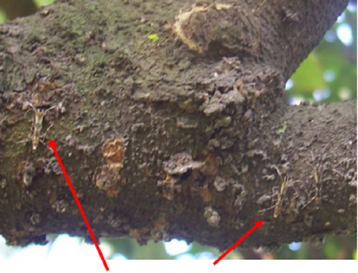 三、檢查藥效,及時進(jìn)行補(bǔ)藥噴殺。根據(jù)成蟲白天棲于陰涼的樹冠內(nèi)膛枝桿上(如下右圖),受到驚嚇時會飛離枝桿這一特性,可每天清晨到果園進(jìn)行實地調(diào)查,對荔枝內(nèi)膛的枝桿進(jìn)行拍打(如下左圖),如發(fā)現(xiàn)還有成蟲飛出,2天后再次噴藥。