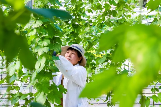 在云臺(tái)農(nóng)場(chǎng)興墾科技的現(xiàn)代智能玻璃溫室大棚里,今年第一茬啤酒花剛剛采收完畢。尚未采收的啤酒花仍在蓬勃生長(zhǎng),一株株順著吊蔓繩向上攀緣。農(nóng)場(chǎng)采用了國(guó)內(nèi)領(lǐng)先的無土栽培模式,以粗細(xì)椰糠為基質(zhì),配合空氣源溫控、漫散射玻璃、水肥一體化滴灌等先進(jìn)技術(shù),精準(zhǔn)復(fù)刻并優(yōu)化了啤酒花的理想生長(zhǎng)環(huán)境。