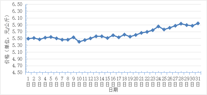 1月,全國香蕉日平均交易價(jià)格最高為5.9元/千克,最低為5.4元/千克,全月平均價(jià)格為5.6元/千克,同比上漲1.8%,環(huán)比上漲5.7%(每日價(jià)格變化如圖)。