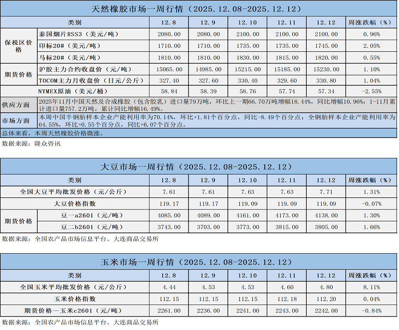 天然橡膠、大豆、玉米市場一周行情(2025.12.08-12.12)