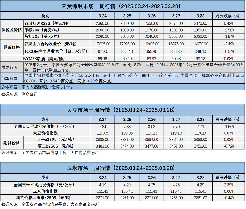 天然橡膠、大豆、玉米市場(chǎng)一周行情(2025.03.24-03.28)