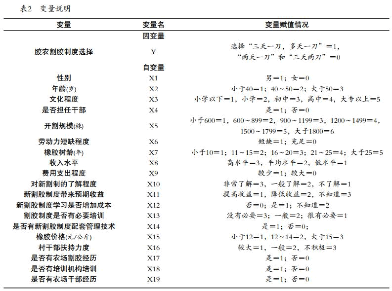 設(shè)計(jì)問(wèn)卷調(diào)查表,實(shí)地調(diào)查膠農(nóng)對(duì)橡膠割制選 擇行為,分別對(duì)海南儋州白沙、瓊中、瓊海,云南西雙版納等地選取不同植膠水平的農(nóng)村進(jìn)行隨機(jī)抽樣調(diào)查,具體變量說(shuō)明見(jiàn)表2。