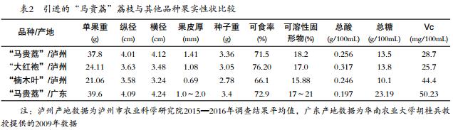 2013—2016年的調(diào)查數(shù)據(jù)顯示,引進(jìn)的“馬貴荔”荔枝與瀘州“大紅袍”荔枝嫁接親和性好,表現(xiàn)適應(yīng)瀘州地區(qū)氣候環(huán)境,高接換種后樹(shù)體生長(zhǎng)好,易成花結(jié)果,較豐產(chǎn)。引進(jìn)的“馬貴荔”荔枝主要物候期均晚于瀘州地區(qū)主栽的“大紅袍”荔枝和晚熟的“楠木葉”荔枝,果實(shí)成熟期較“大紅袍”荔枝晚30d左右,較“楠木葉”荔枝晚7d左右。引進(jìn)的“馬貴荔”荔枝銷售時(shí)間錯(cuò)開(kāi)了瀘州荔枝上市高峰期,延長(zhǎng)了瀘州荔枝上市時(shí)間,對(duì)擴(kuò)大瀘州地區(qū)荔枝晚熟優(yōu)勢(shì)有所幫助。引進(jìn)的“馬貴荔”荔枝銷售價(jià)格連續(xù)3年高于當(dāng)?shù)刂髟缘摹按蠹t袍”荔枝和晚熟的“楠木葉”荔枝,商品價(jià)值較高。與原產(chǎn)地相比,引進(jìn)的“馬貴荔”荔枝在主要果實(shí)性狀和品質(zhì)上基本保持了原有的優(yōu)良特性,并優(yōu)于瀘州地區(qū)主栽的“大紅袍”荔枝和晚熟的“楠木葉”荔枝。但與“帶綠”“紅繡球”等優(yōu)質(zhì)晚熟荔枝相比,“馬貴荔”荔枝在品質(zhì)上還存在某些方面的不足,如核大、成熟后味道容易變淡等。從綜合性狀看,“馬貴荔”荔枝適合在瀘州荔枝優(yōu)勢(shì)發(fā)展區(qū)進(jìn)行適量推廣應(yīng)用,其特遲熟等特性將為瀘州地區(qū)荔枝雜交育種提供一份難得的種質(zhì)資源。