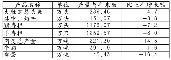 畜牧業(yè)占農(nóng)業(yè)總產(chǎn)值比重為20.4%,比去年下降1.8個(gè)百分點(diǎn);牲畜年末存欄總數(shù)及主要畜產(chǎn)品產(chǎn)量(見(jiàn)表2)。